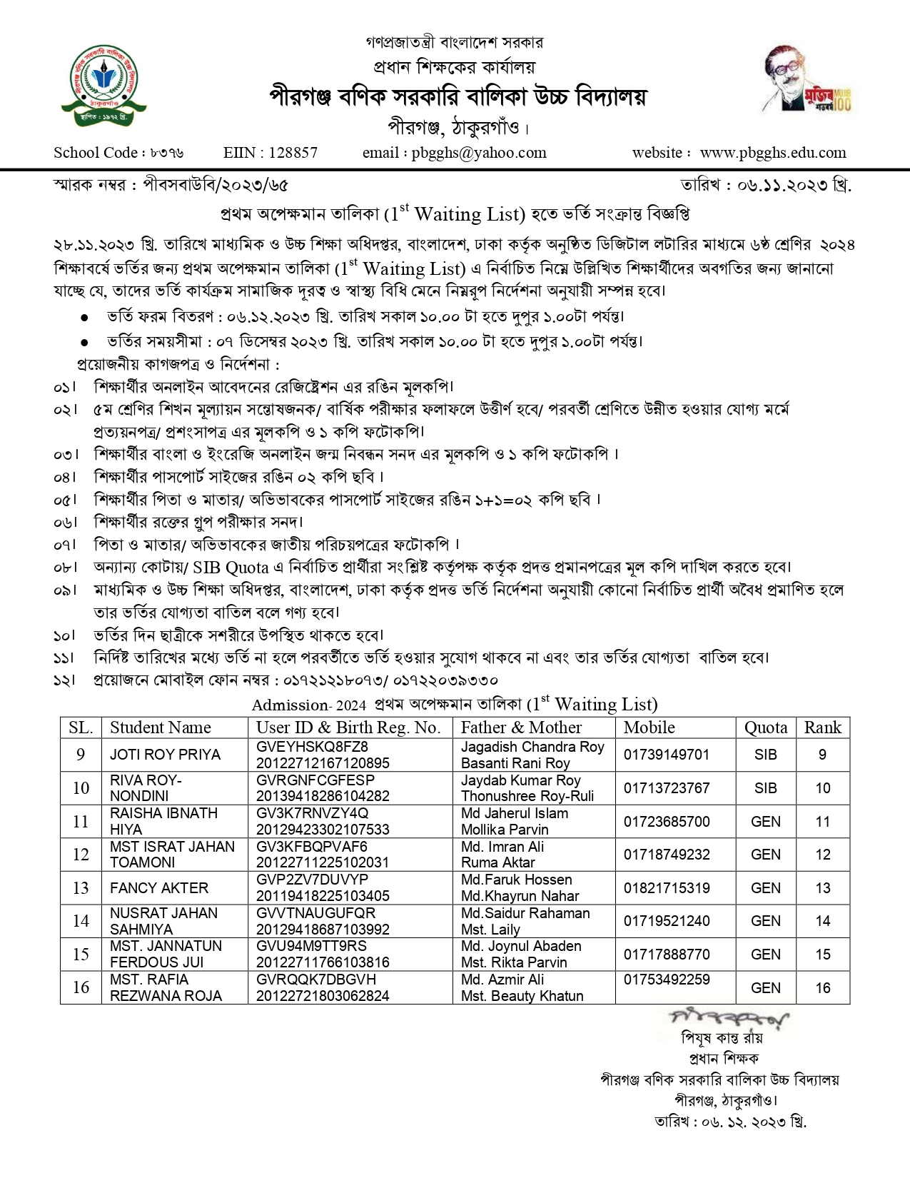 ২০২৪ শিক্ষাবর্ষের প্রথম অপেক্ষমান তালিকা হতে ভর্তি সংক্রান্ত বিজ্ঞপ্তি
