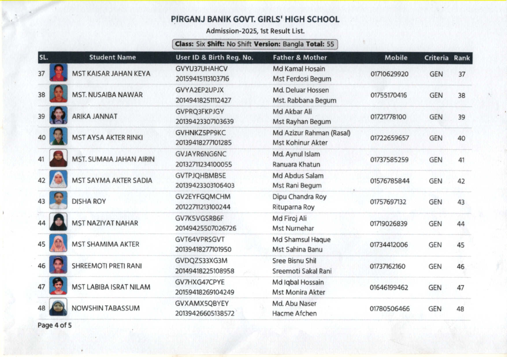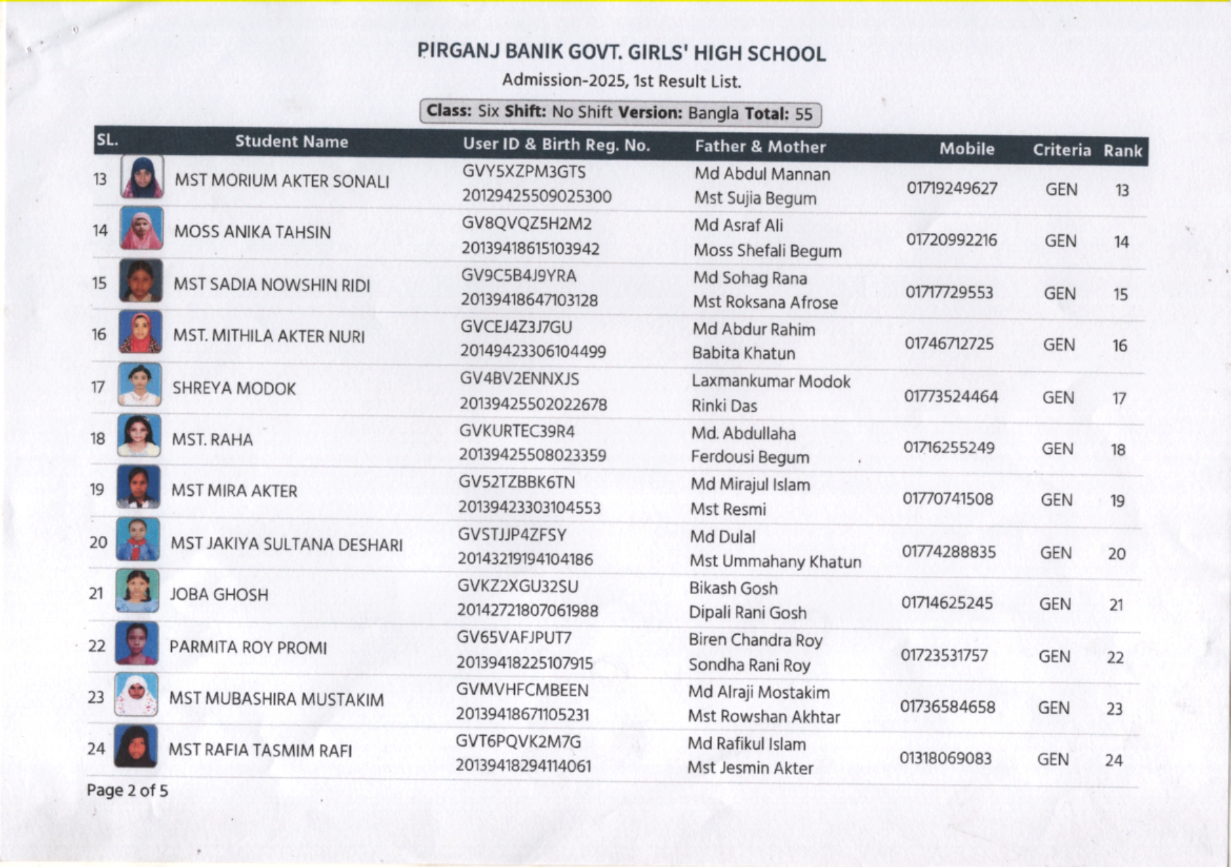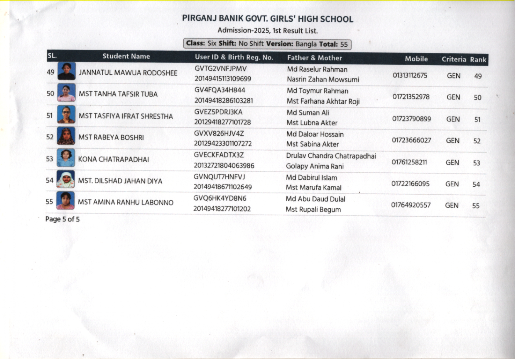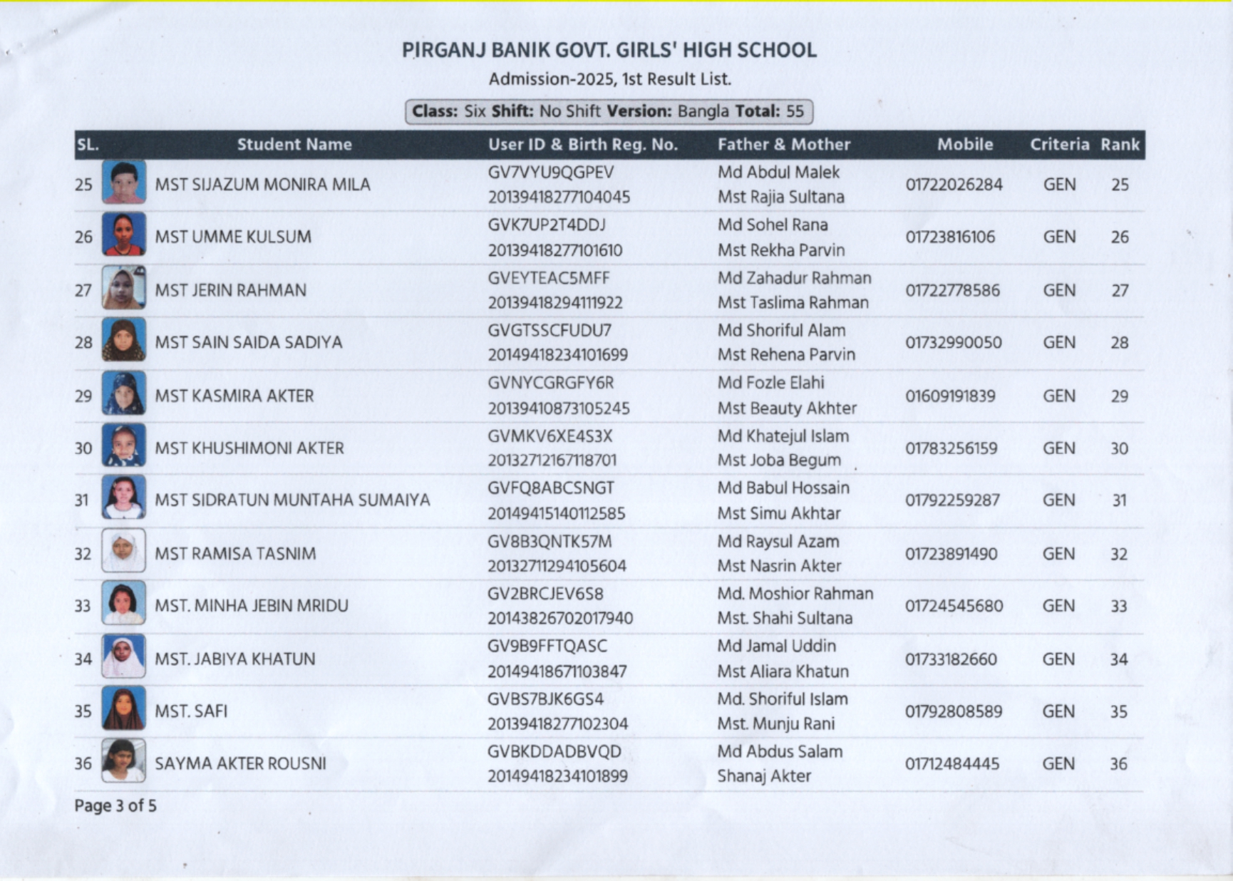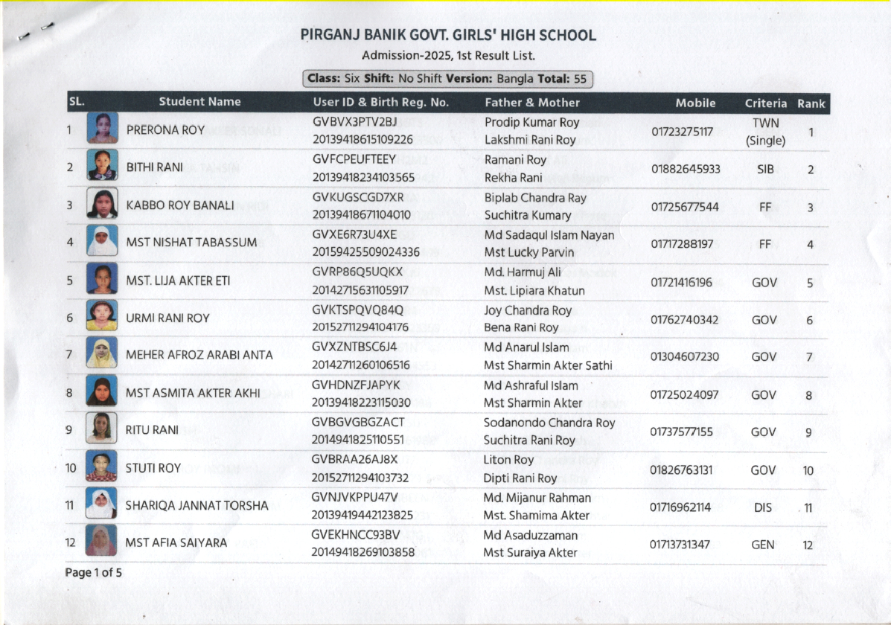 ২০২৫ শিক্ষাবর্ষে ষষ্ঠ শ্রেণিতে শিক্ষার্থী ভর্তির প্রথম ফলাফল তালিকা (1st Result List)।